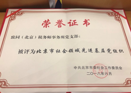 6月27日下午,中共北京市委社會工作委員會在北京會議中心召開《北京市社會領域紀念建黨97周年暨黨建工作推進會》,表彰近年來全市社會領域基層黨組織和廣大黨員在各條戰線、各項工作中銳意進取、改革創新取得成績的先進基層黨組織、優秀共產黨員、優秀黨務工作者和優秀黨建活動品牌工作各100名,以此激勵各級黨組織和全體黨員“不忘初心、牢記使命”,決勝全面建成小康社會。經市稅協黨委推薦,市委社會工委審核,致同(北京)稅務師事務所黨支部榮獲《社會領域先進基層黨組織》光榮稱號,參加會議,受到表彰。希望各稅務師事務所黨組織以四好(領導班子好、黨員隊伍好、工作機制好、群眾反映好)先進基層黨組織基本要求為指引,不斷增強黨組織的戰斗力、凝聚力和創造力,在黨建工作中銳意進取、創出品牌,在推動發展、深化改革、服務社會、創新社會治理中創出佳績,再立新功。
