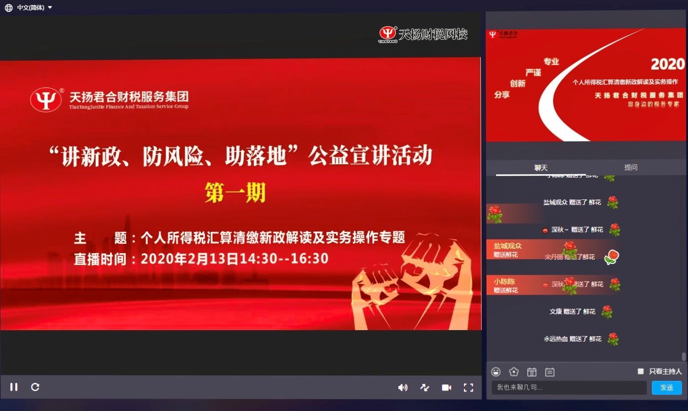 2020年這個春天必定讓我們永生難忘!疫情的發展牽動著我們每一個人的心,在各行各業“防控疫情”期間,天揚君合作為國家財稅戰線的一份子,積極響應國家號召結合國家出臺的財稅新政,切實履行社會責任,從2月份開始舉辦四期“講新政、防風險、促落地”主題線上公益課堂活動,圍繞“個人所得稅匯算清繳、個人境外所得、大企業風險管控、增值稅稅務規劃”四大內容開展公益宣講。