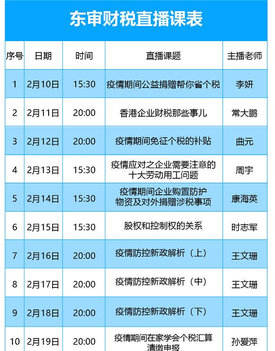 一場突如其來的疫情,包括審信東審稅務師事務所等很多行業在內的企業正在經歷著一次史無前例的大考。只有想客戶之所想,攜手共進,共克時艱,才能贏得未來。作為一家全國最高等級5A級涉稅專業服務機構,在這個特殊時期,更要充分發揮稅務中介機構專業作用。審信東審稅務師事務所特在疫情期間,開通了東審財稅公益直播免費課程,發揮稅務行業優勢,解讀時政稅收政策,幫扶廣大客戶,專業幫助其共渡難關,維護經濟穩定,助力企業持續健康發展。