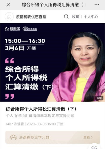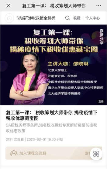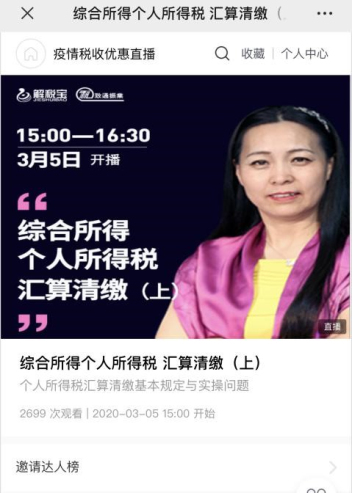 疫情期間,日常稅務培訓課程也轉換了工作模式,及時開展了線上直播課程。北京致通振業稅務師事務所的大咖老師、公司執行總裁、高級稅務師邵曉琳老師分別在3月1日、5日、6日開展了三期線上直播課程。三期課程分別圍繞 “個人所得稅匯算清繳”和“疫情下企業稅收優惠政策解析”兩大主題進行講解,直播在抖音、微博、微信公眾號上同步進行,在線觀看人數達到上萬人,受到了網友們熱烈歡迎和一致好評。