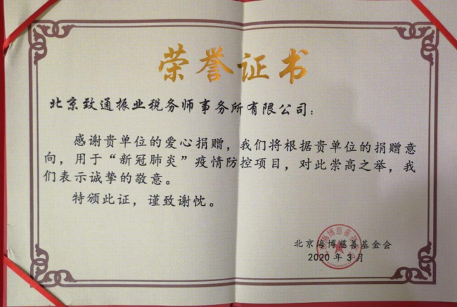 在全國上下齊心協力共同抵抗疫情時,致通振業稅務師事務所率先垂范。在大年初五,董事長李記有召開線上董事會,發出“抗擊疫情,我們也應該出一份力”的倡議,得到董事會成員、合伙人一致認同,并將募捐意見反映到北京稅協,積極聯系慈善總會,北京致通振業帶頭將十萬元用于此次疫情防控的款項打到了北京慈善總會和北京海博慈善基金會的賬戶上。