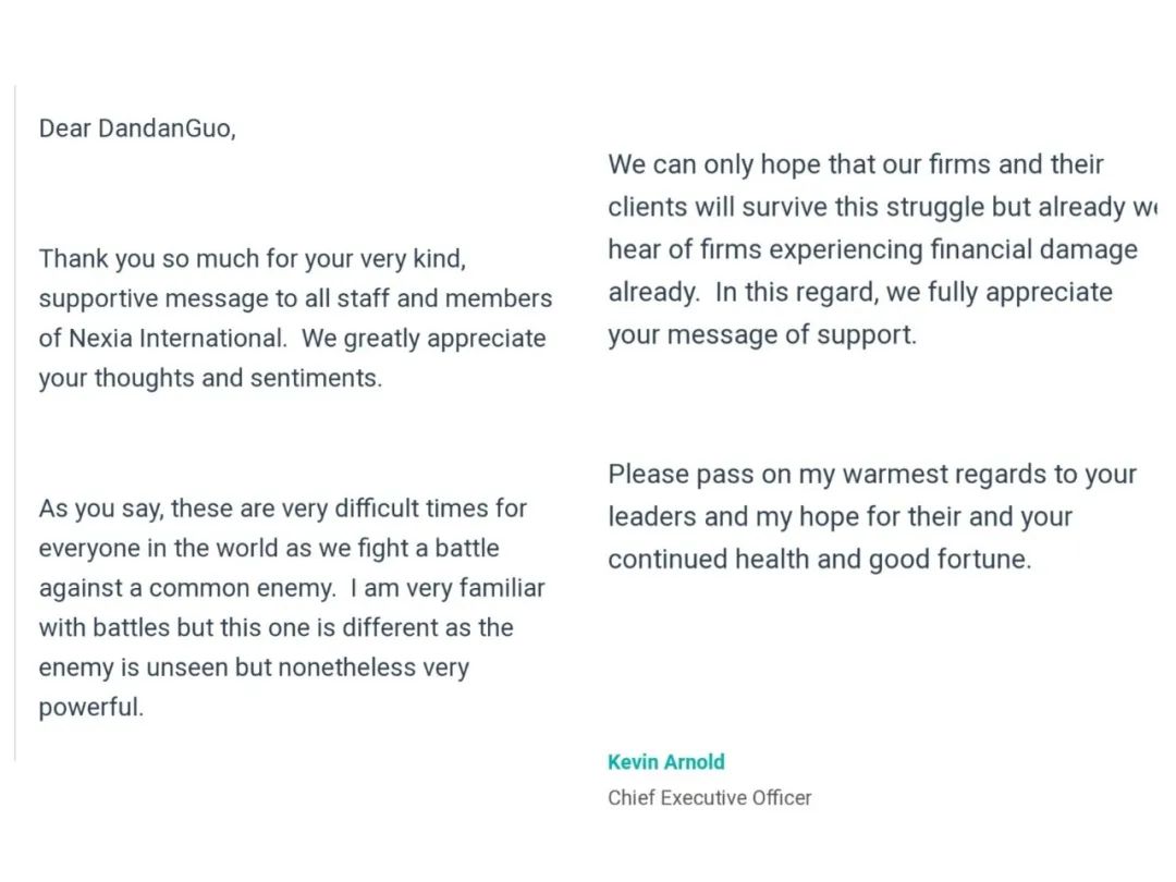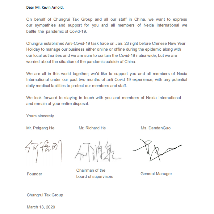 在疫情在意大利開始蔓延之時,中瑞國際集團的創始人何培剛先生、總經理何源泉先生,以及中瑞稅務集團總經理郭丹丹女士聯名給Nexia國際總裁Kevin Arnold先生等Nexia國際主要領導人發去信函,“we are one ”, 為應對新冠疫情中瑞愿意為各成員所提供力所能及的幫助,包括抗疫物資、設備等。Nexia總部將這封信函傳達給了各成員所,特別是深受疫情影響的意大利成員所,我們也收到總裁先生、亞太區總監Kristin女士及意大利成員所的感謝回函!