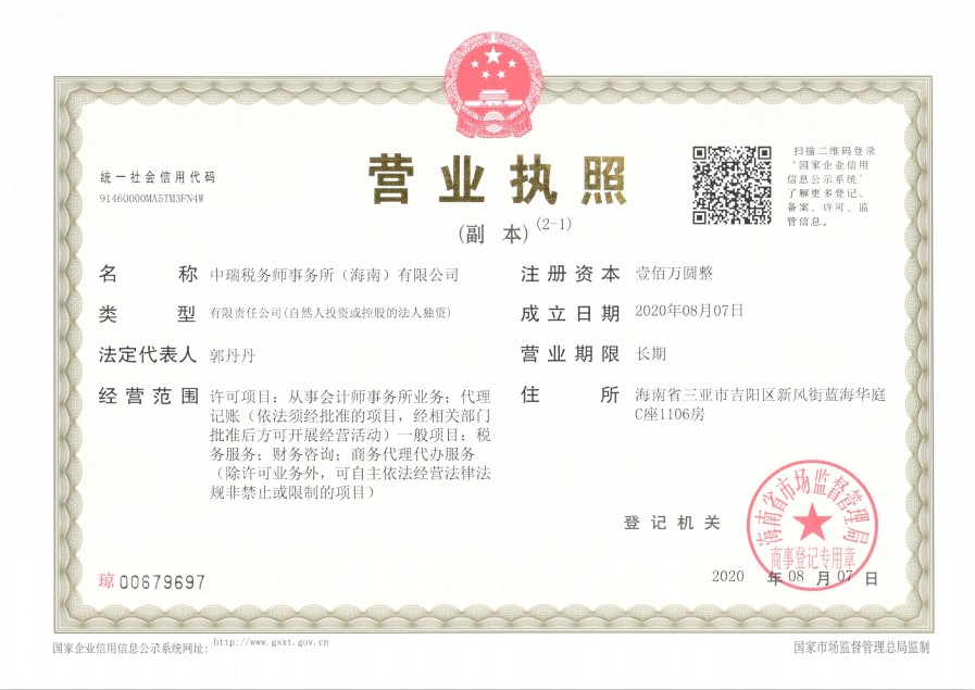 2020年8月7日,中瑞稅務(wù)師事務(wù)所(海南)有限公司正式取得營業(yè)執(zhí)照,中瑞稅務(wù)集團(tuán)的第50家分支機(jī)構(gòu)落地海南。